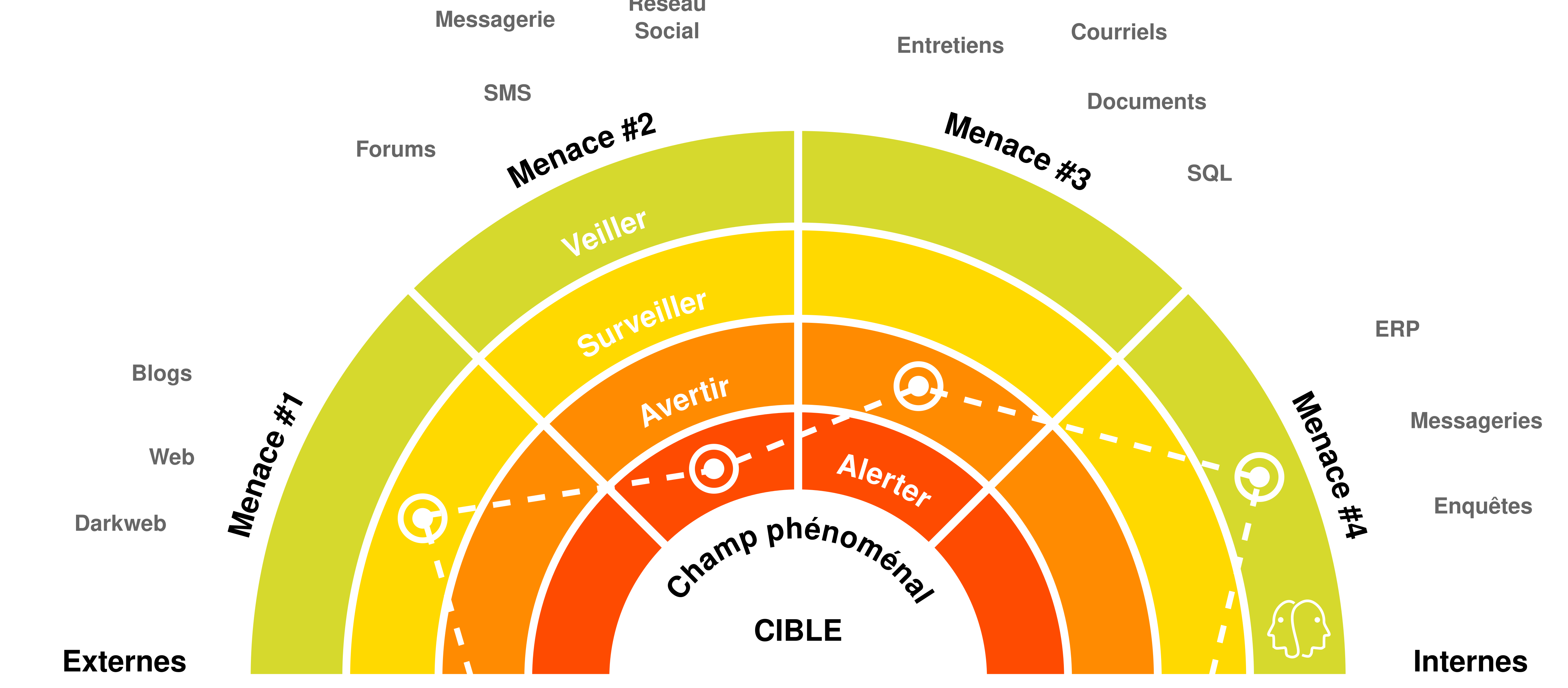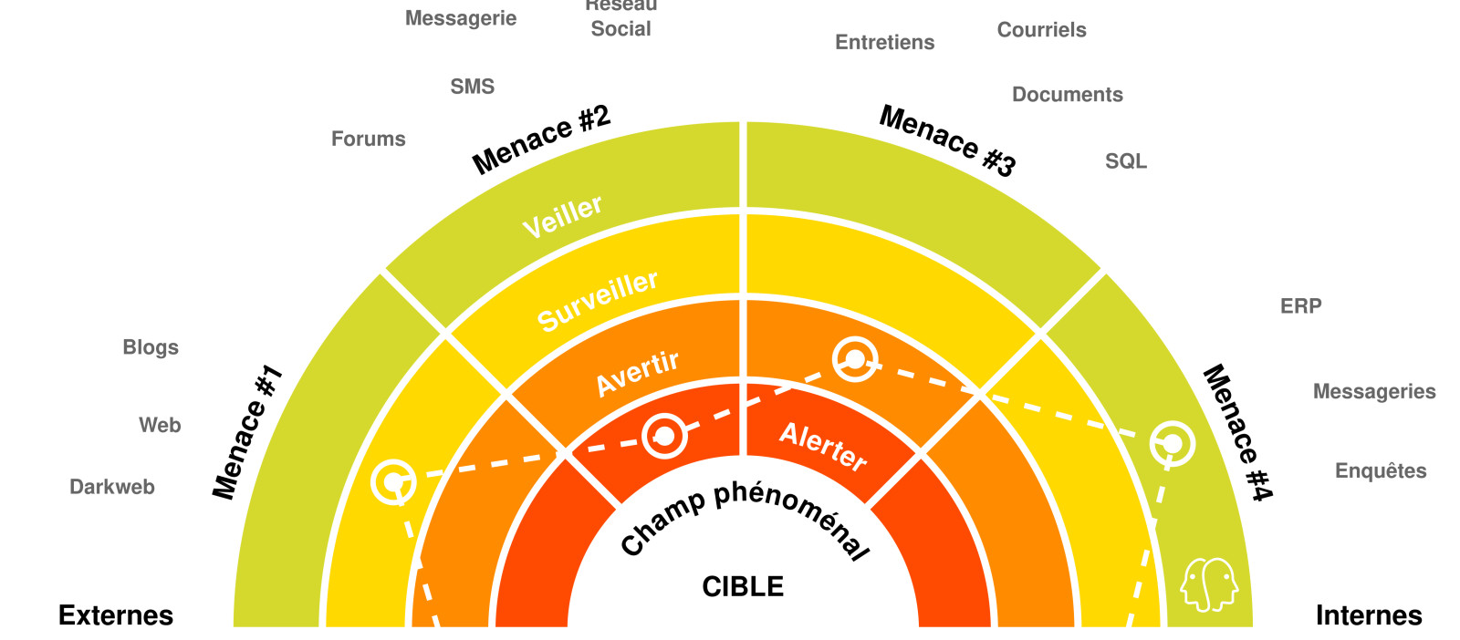 La seconde étape consiste à lister toutes les menaces internes et externes qui sont dans l’environnement de la cible puis de découper ce radar en secteurs, en parts égales, un peu à la manière d’un gâteau, où chaque secteur va représenter une menace.